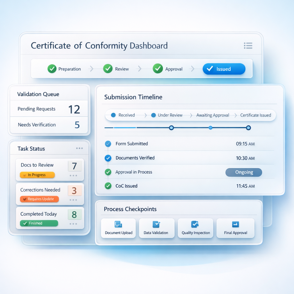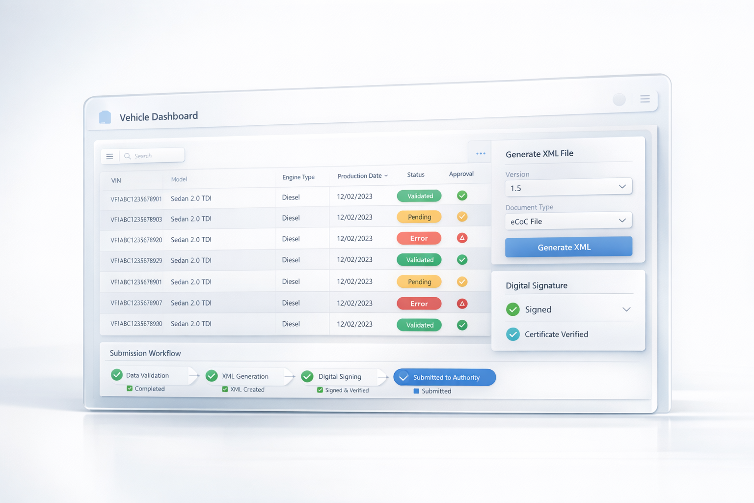 eCoC EU gives manufacturers one governed workspace for vehicle records, XML generation, validation, digital signing, and delivery readiness across the European Union.