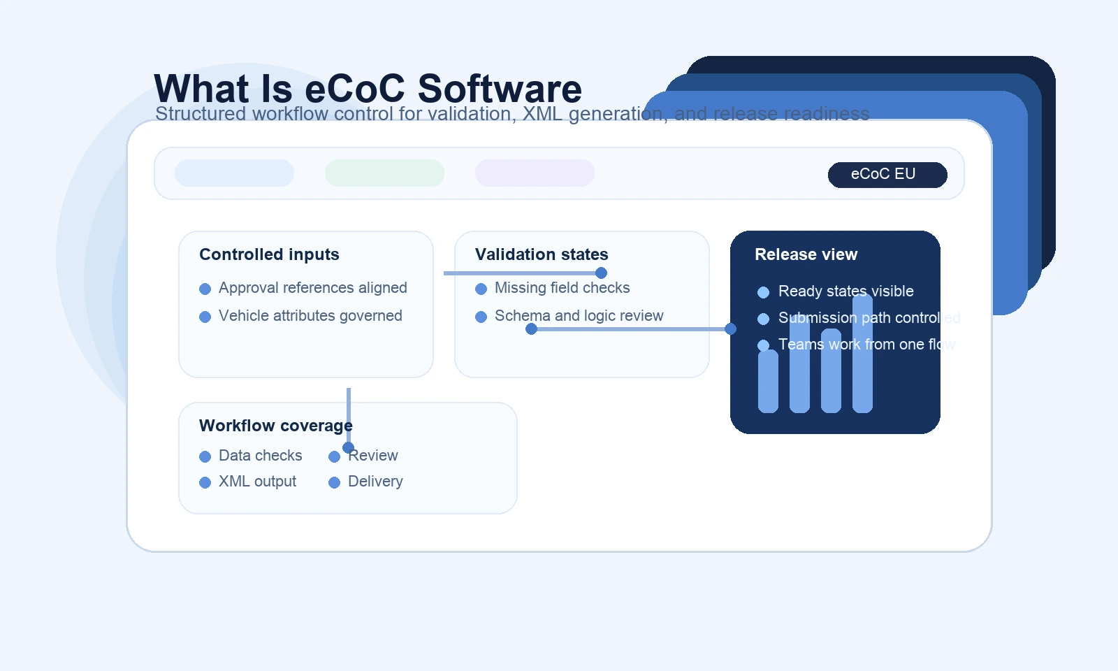 Compliance teams do not only need output files. They need confidence that the output reflects the approved basis and that the supporting vehicle information is still aligned across the workflow. That is why eCoC software belongs inside the larger context of vehicle compliance systems rather than sitting outside the process as an isolated document tool.